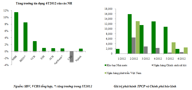 Thanh khoản cải thiện, huy động vốn từ nền kinh tế tăng khá và lãi suất huy động chủ động giảm dần nhưng tín dụng hầu như không tăng trưởng. Do đó, thị trường trái phiếu, tín phiếu trong 6T2012 sôi động và số dư trên thị trường mở đã sụt giảm mạnh vào cuối quý II.