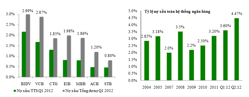 Tỷ lệ nợ xấu được công bố với nhiều con số khác nhau. Đầu tiên là 4,47% tại 31/05/2012 do các TCTD báo cáo và sau đó là 8,6 tại 31/03/2012 do Cơ quan thanh tra giám sát NHNN.