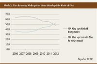 Lập luận trên càng được củng cố khi chúng ta phân tích cơ cấu xuất nhập khẩu của FDI so với phần còn lại trong nước. Hình 1 cho thấy, kể từ năm 2009, xuất khẩu của FDI đã tăng tốc và chiếm thị phần áp đảo so với kinh tế trong nước. Thế nhưng, hình 3 cho chúng ta thấy thị phần nhập khẩu từ nhóm FDI cũng gia tăng theo chiều hướng và mức độ ngày càng cao hơn.